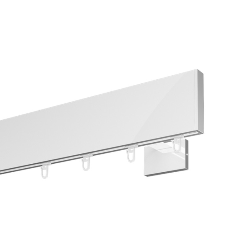 Hliníková hranatá garniža TOP LINE vo farbe biela lesklá. Vyvážené proporcie, neutrálne farebné prevedenie a jednoduchá línia robia z tejto garniže výrazný dekoratívny prvok  v každom interiéri. Montážna drážka v profile umožňuje presné nastavenie polohy konzoly. Drážka široká 6 mm je prispôsobená pre väčšinu bežcov s háčikmi.  Výška profilu TOP LINE je 8 cm.